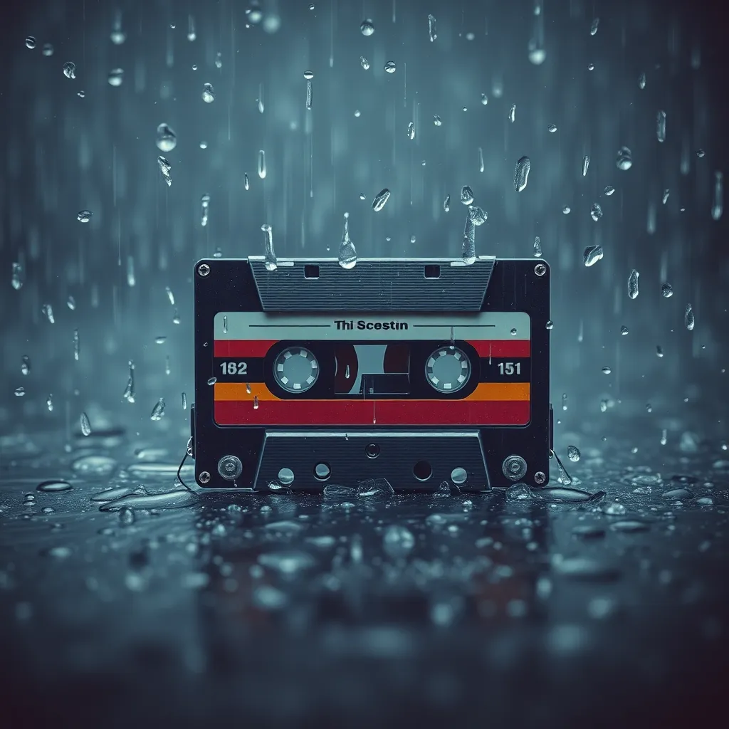 male baritone raw spoken-word English, waltz rhythm 98 BPM (3/4), found sounds only (1970s rain cassette tape machine heartbeat breath paper), analog tape effects only (heavy saturation deep wow/flutter vinyl crackle tape echo), no reverb no instrume...
