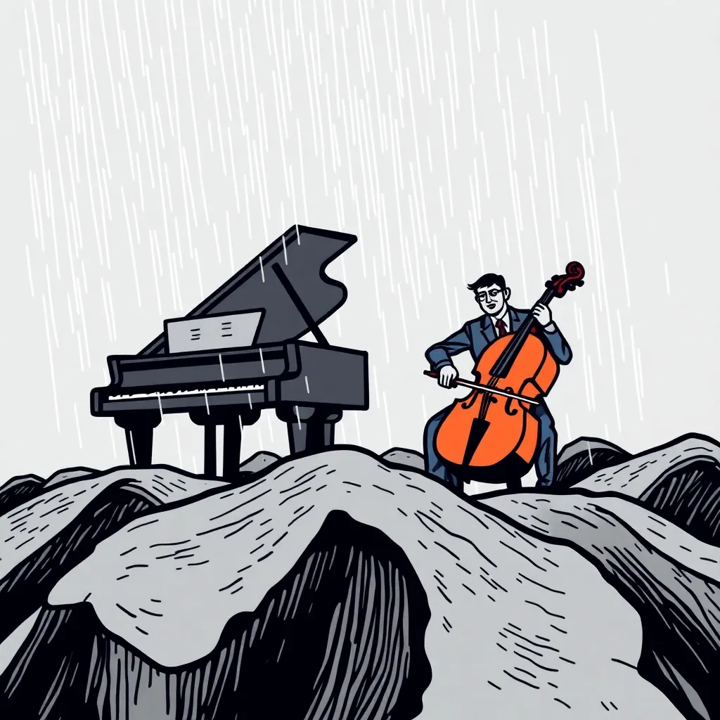 Atmospheric electronic, deep cello solos, subtle 808 bass, ambient rain textures, 60-75 BPM |