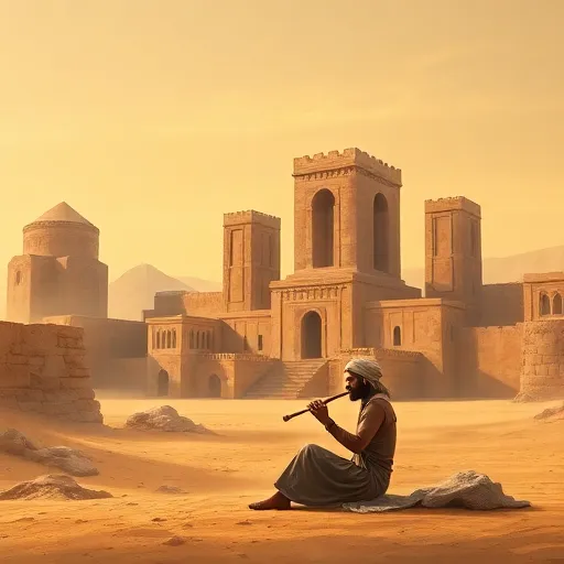 Ney flute, oud strings, darbuka rhythm, ancient atmosphere, fading outro. |