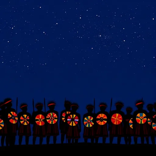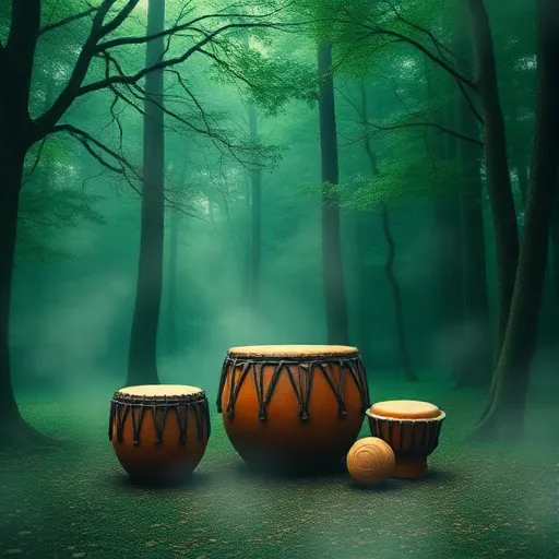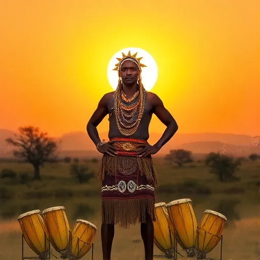African drums, kalimba melody, choir vocals, rhythmic chanting, tribal atmosphere, fading outro. |